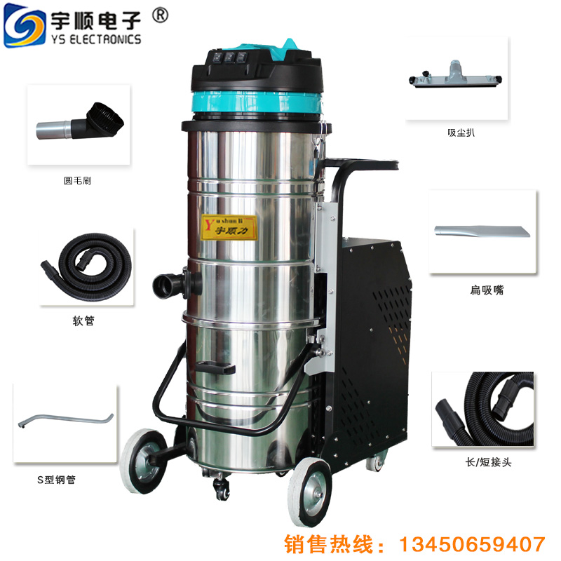 宇顺力YS-3600D 大功率工业吸尘器,3.6KW,100L容量,圆形不锈钢桶身,美观、轻便、坚固耐用,配备强劲静音型专业电机,三档位控制。脉冲反吹震尘系统,可以有效防止过滤器堵塞,时间继电器可以针对不同工况设置自动脉冲的时间间隔。吸力大,功效强,标配高效过滤采用星型袋式过滤器,过滤面积大,对于当量直径在0.3μm以上的颗粒过滤。